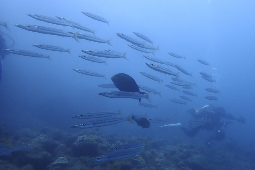 テトラの近くでは変わらずカマスたちがいて、カンムリブダイの姿もちらりと見れたり、