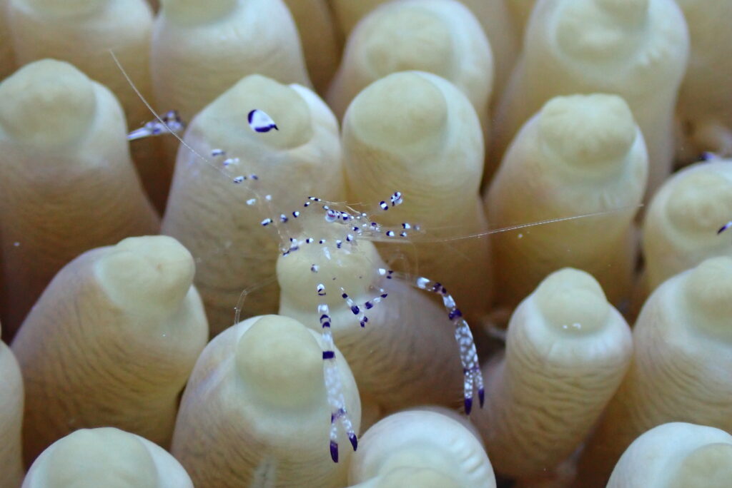 透明ボディですが、手先はおしゃれ柄なニセアカホシカクレエビ